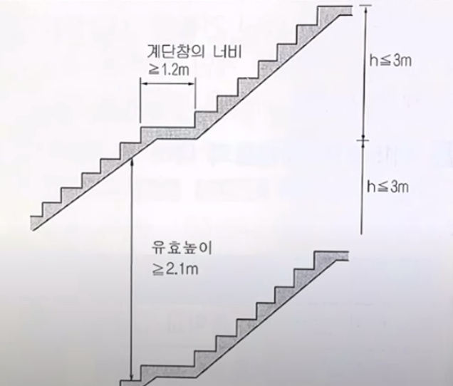 계단의 경우는 높이가 3m 이상일 경우에는 1.2m 이상의 계단참을 설치해야 된다고 나와있다.