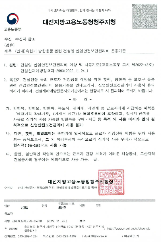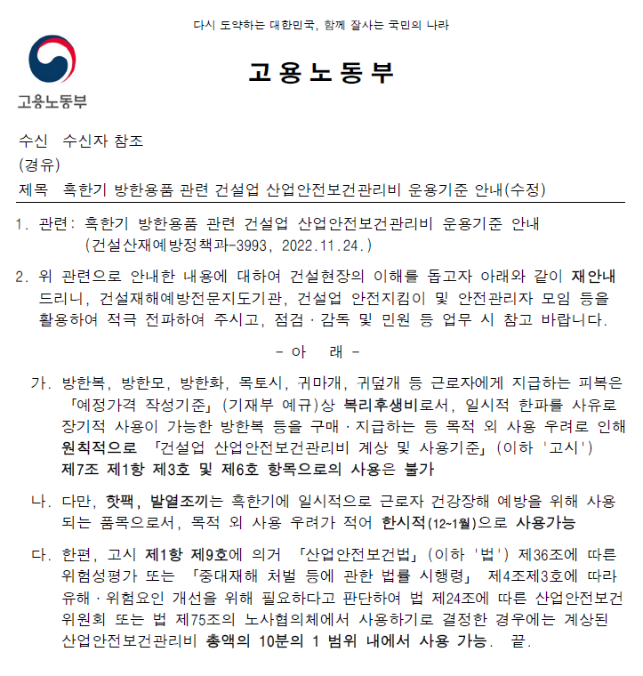 관련 : 혹한기 방한용품 관련 건설업 산업안전보건관리비 운용기준 안내(건설산재예방정책과-3993, 2022.11.24.)
